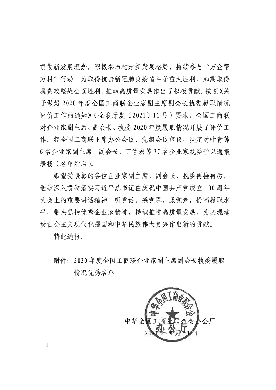 近日,全国工商联发布《关于对2020年度履职情况优秀的全国工商联企业家副主席副会长执委给予表扬的通报》。《通报》指出,2020年度面对突如其来的新冠肺炎疫情冲击影响,各位企业家副主席、副会长、执委认真学习贯彻习近平新时代中国特色社会主义思想,以实际行动响应中央号召,积极投身抗击疫情狙击战,统筹做好疫情防控和复工复产,主要服务“六稳”“六保”,认真贯彻新发展理念,积极参与构建新发展格局,持续参与“万企帮万村”行动,为取得抗击新冠肺炎疫情斗争重大胜利、如期取得脱贫攻坚战全面胜利、推动高质量发展作出了积极贡献。按照《关于做好2020年度全国工商联企业家副主席副会长执委履职情况评价工作的通知》要求,全国工商联对企业家、副主席、副会长、执委2020年度履职情况开展了评价工作。经全国工商联主席办公室会议、党组会议审议,决定对叶青等6名企业家副主席、副会长,丁佐宏等77名企业家执委予以通报表扬。
